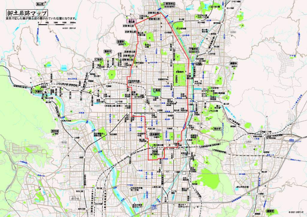 この地図は、現代の地図に御土居の位置を記したものです。御土居は時代とともに壊されていきますが、その姿を一部留める御土居跡が京都市内にいくつか残っています。史跡としては9箇所指定されており、この『御土居跡マップ』地図上でもその位置を記しています。